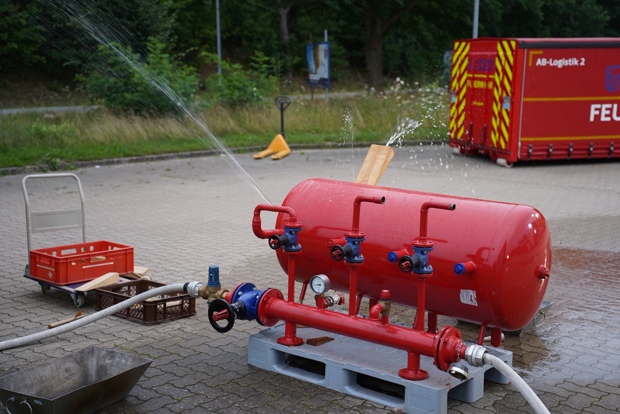 Dank der vom Landkreis Harburg bereitgestellten Übungsanlage konnten wir einen Einsatz unter realistischen Bedingungen trainieren. Ein Unfall mit Ammoniak auf einem Betriebsgelände wurde simuliert. Die Anlage verfügt über verschiedene Hebel und Öffnungen, die gezielt Lecks verursachen und mit Wasser geflutet werden können, um den Austritt von Gefahrstoffen nachzustellen.