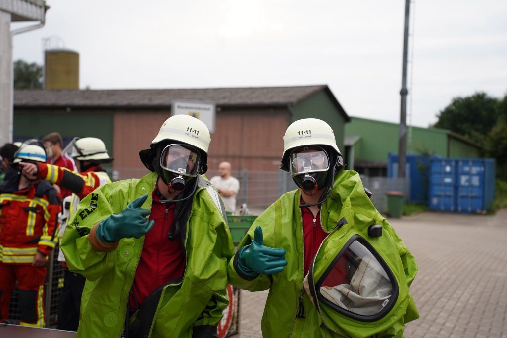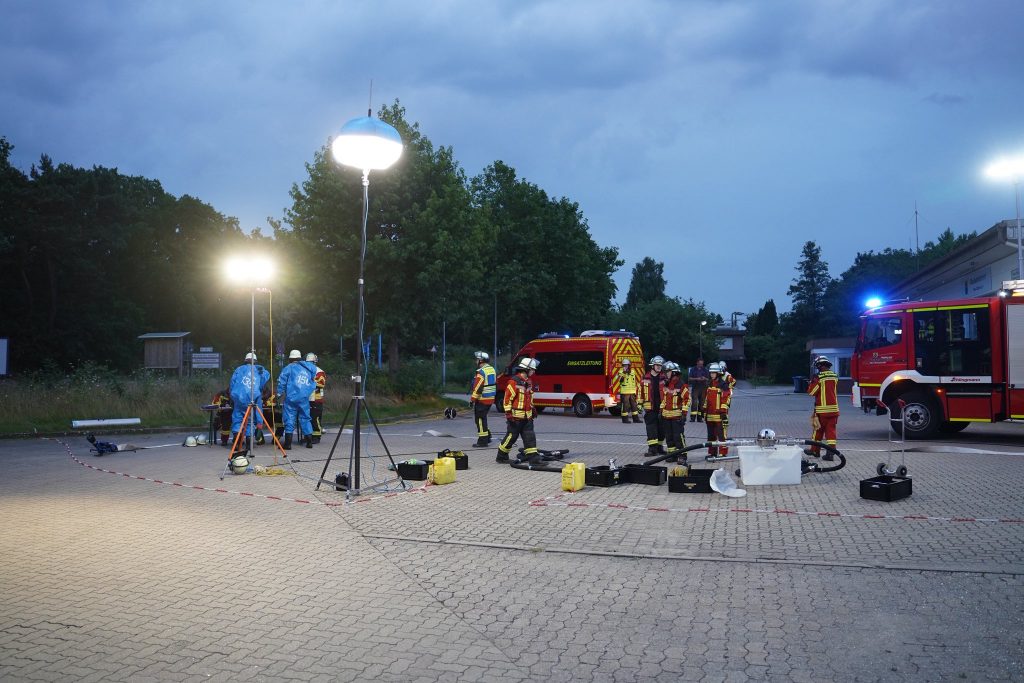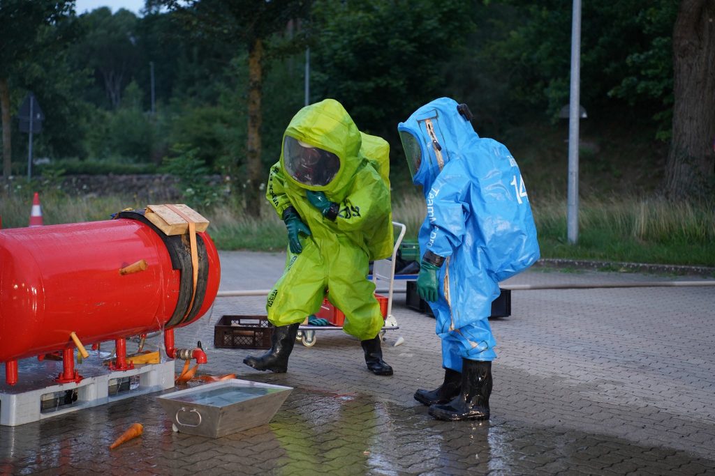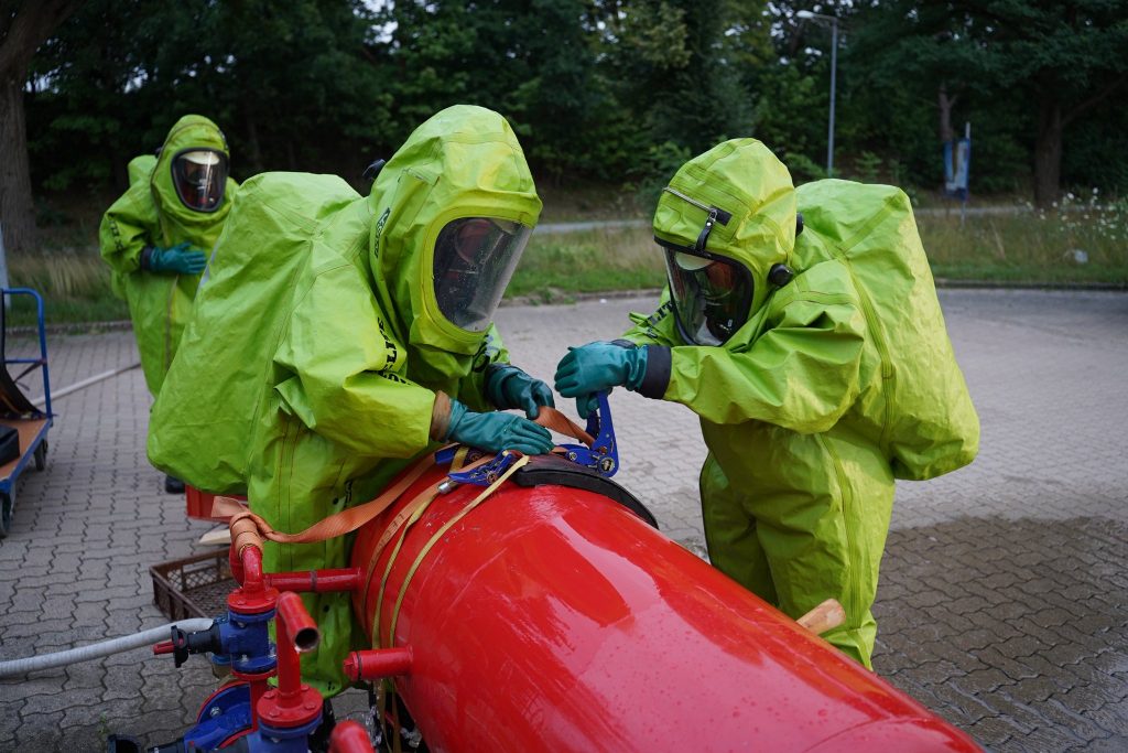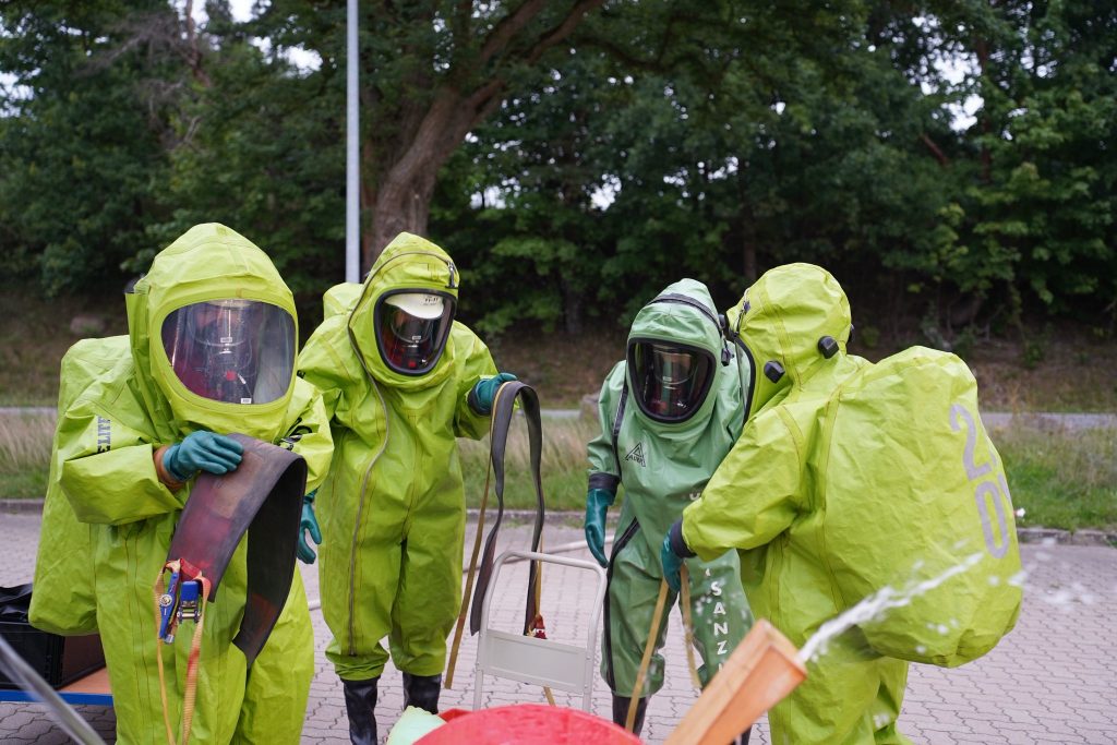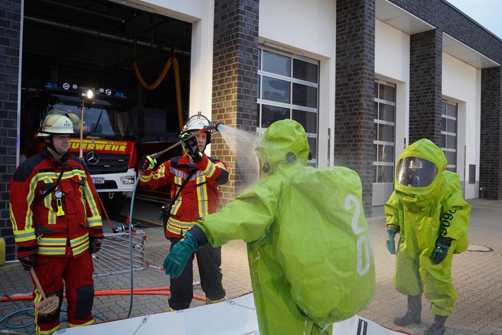 Neben dem direkten Einsatz wurde außerhalb des Gefahrenbereiches eine Sofort-Dekontaminationsstelle eingerichtet. Diese ermöglicht es, im Ernstfall schnell verletzte oder kontaminierte Personen zu reinigen. Weitere Kameradinnen und Kameraden kümmerten sich um die Vorbereitung und Bereitstellung des Materials für die CSA-Trupps.