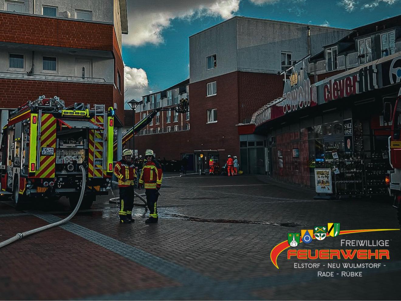 Zunächst alarmierte die automatisierte Brandmeldeanlage unsere Ortsfeuerwehr Neu Wulmstorf. Noch während des Ausrückens liefen mehrere Notrufe in der Rettungsleitstelle Winsen ein und berichteten über eine starke Rauchentwicklung und Flammenschein im 3. Obergeschoss, wodurch das Stichwort im weiteren Verlauf auf „Feuer 3“ erhöht wurde und zusätzlich die Ortsfeuerwehren Elstorf und Rübke alarmiert wurden.
