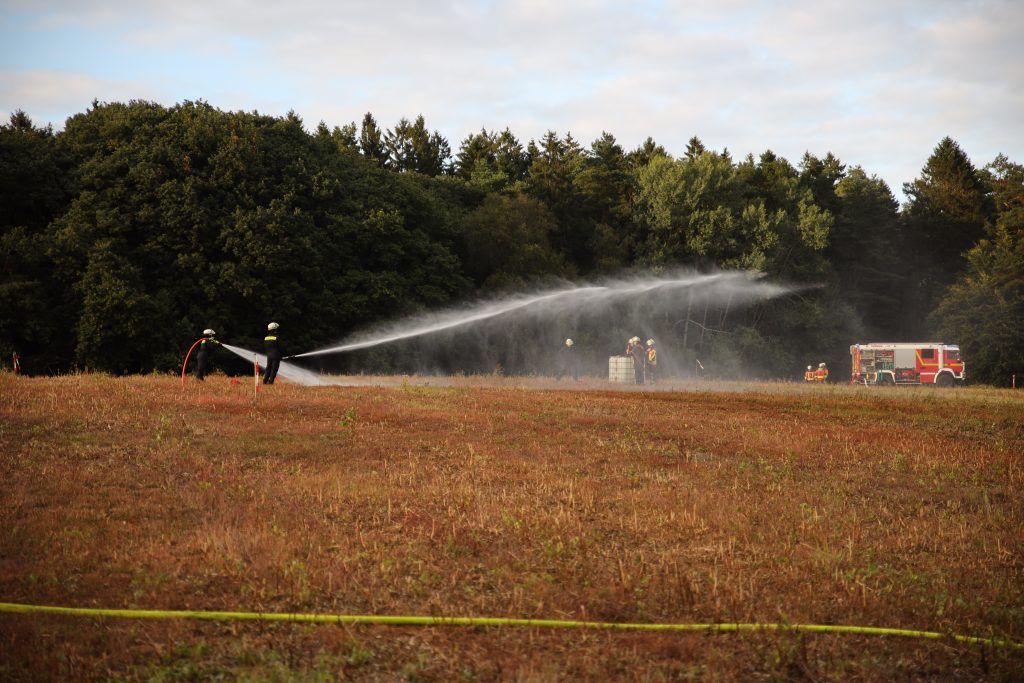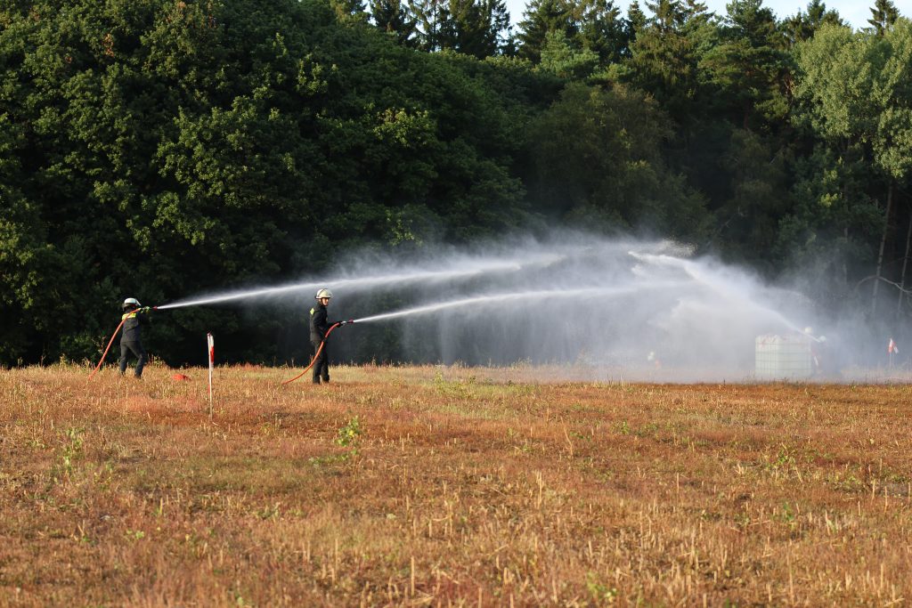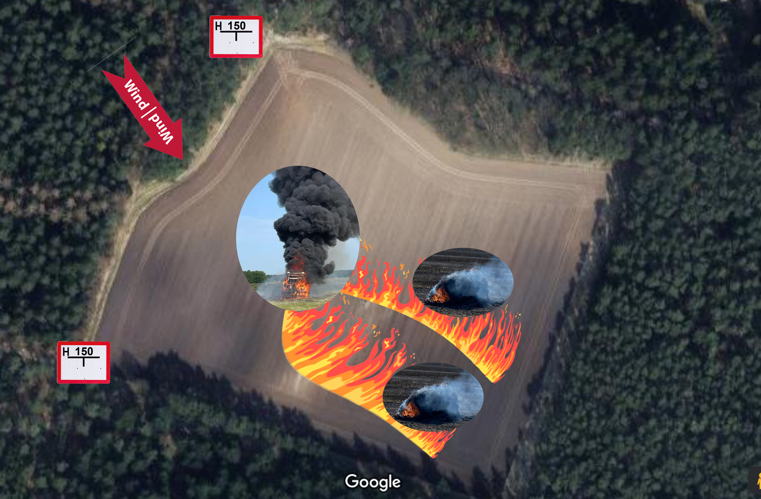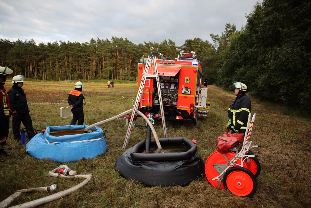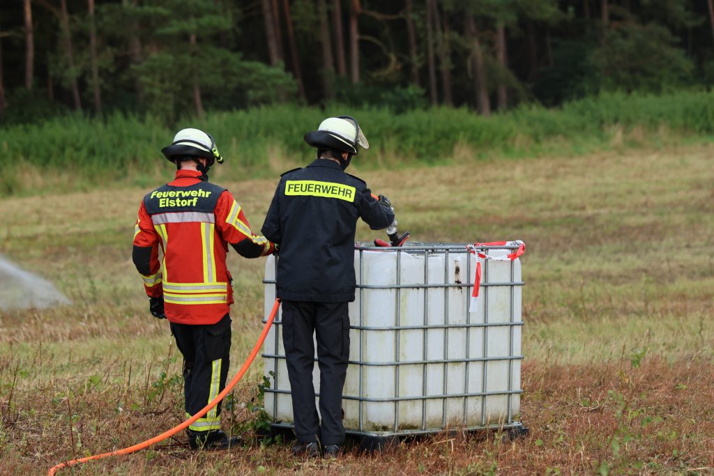 Um kurz nach 18:00 Uhr wurde durch den Übungsleiter der Einsatz erklärt und wie wir an die Brandbekämpfung herangehen. Damit die Kameraden die anderen Fahrzeuge besser kennen lernen, wurden sie auf den Fahrzeugen gemischt. Ziel der Übung war es, mit dem Elstorfer TLF das Feuer vor dem Kiefernwald aufzuhalten und mit dem Kirchdorf 1 das Feuer auf der anderen Seite des Flächenbrandes vor dem Mischwald zu stoppen. Der GW Wald hatte die Aufgabe die Feuerwehren mit D Material auszustatten und danach eine Löschwasserversorgung aufzubauen. Als besonderes Highlight waren die “brennenden Strohballen” die beiden IBC Container, diese mussten mit Wasser bis oben hin gefüllt werden, damit der imaginäre Strohballen auch als gelöscht zählt.