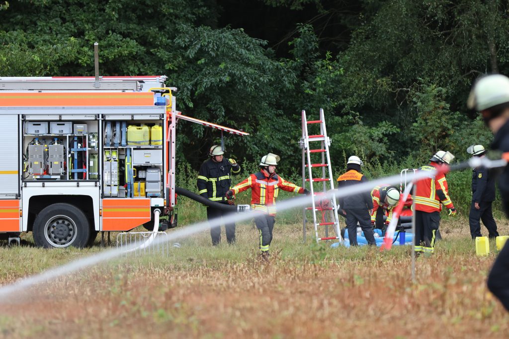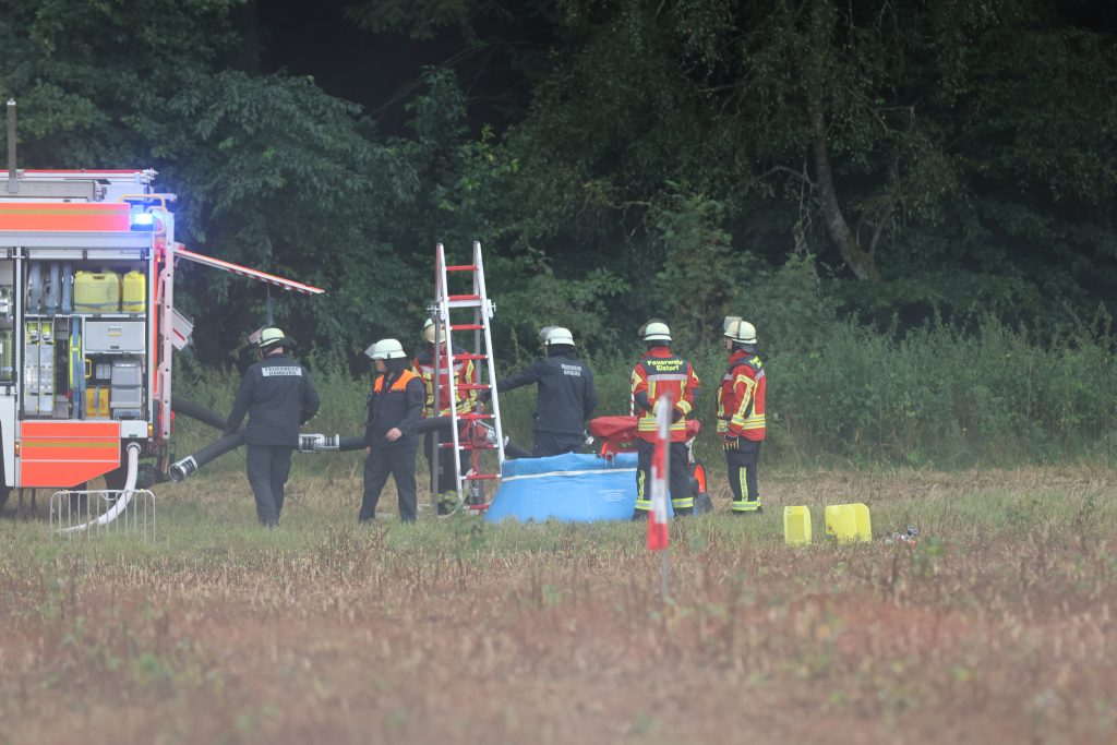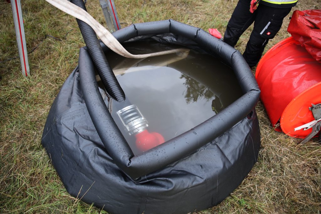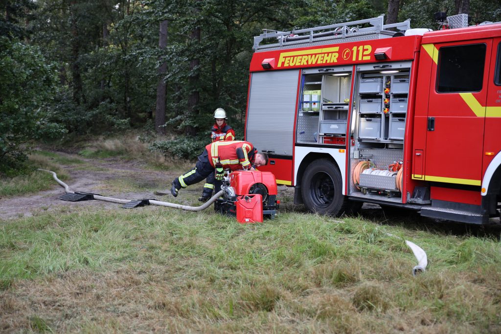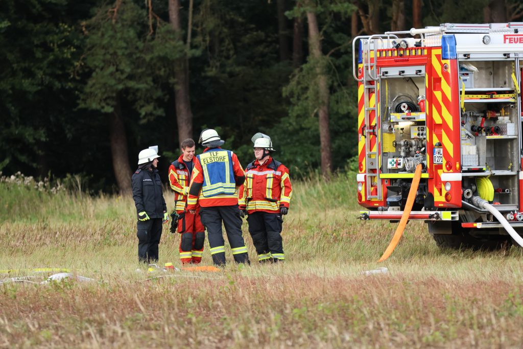 Um kurz nach 18:00 Uhr wurde durch den Übungsleiter der Einsatz erklärt und wie wir an die Brandbekämpfung herangehen. Damit die Kameraden die anderen Fahrzeuge besser kennen lernen, wurden sie auf den Fahrzeugen gemischt. Ziel der Übung war es, mit dem Elstorfer TLF das Feuer vor dem Kiefernwald aufzuhalten und mit dem Kirchdorf 1 das Feuer auf der anderen Seite des Flächenbrandes vor dem Mischwald zu stoppen. Der GW Wald hatte die Aufgabe die Feuerwehren mit D Material auszustatten und danach eine Löschwasserversorgung aufzubauen. Als besonderes Highlight waren die “brennenden Strohballen” die beiden IBC Container, diese mussten mit Wasser bis oben hin gefüllt werden, damit der imaginäre Strohballen auch als gelöscht zählt.